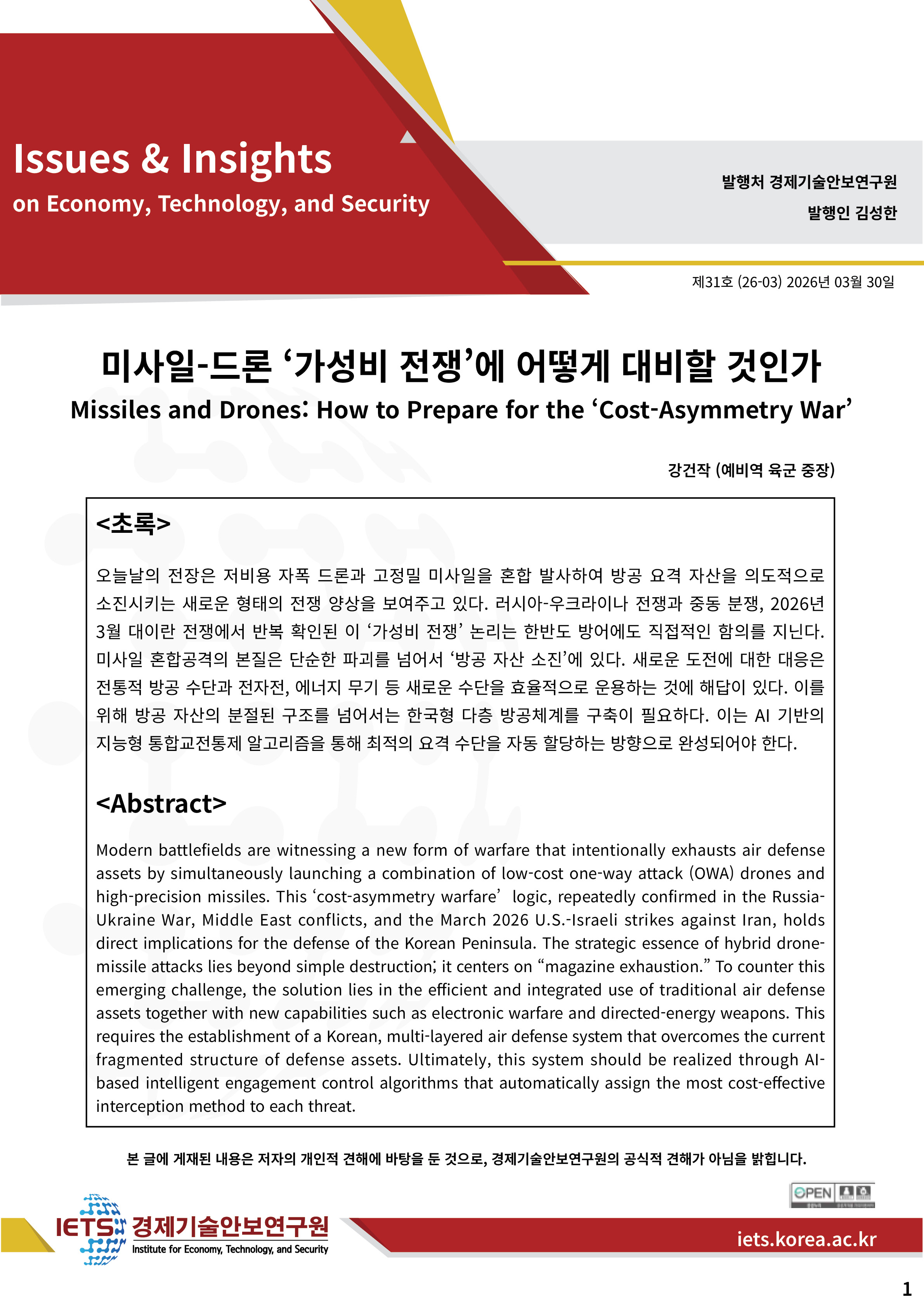 | 제목 | [Issues & Insights 31호] 미사일-드론 ‘가성비 전쟁’에 어떻게 대비할 것인가 |